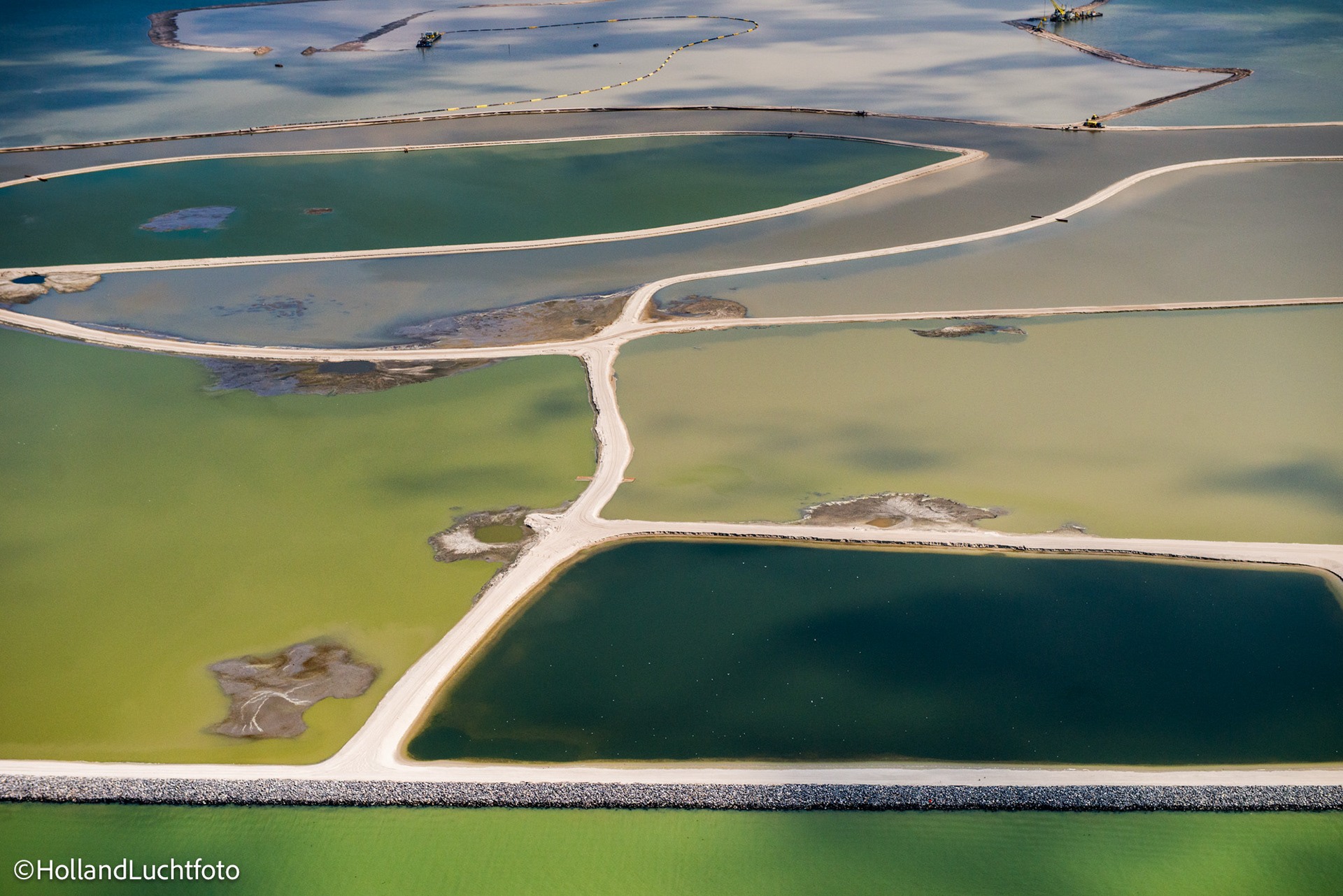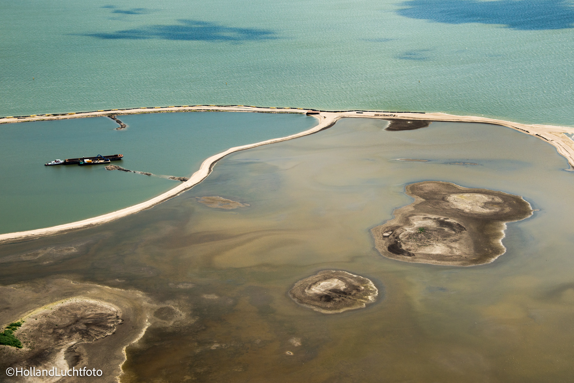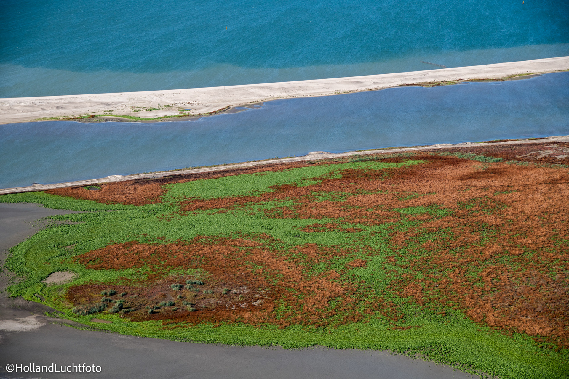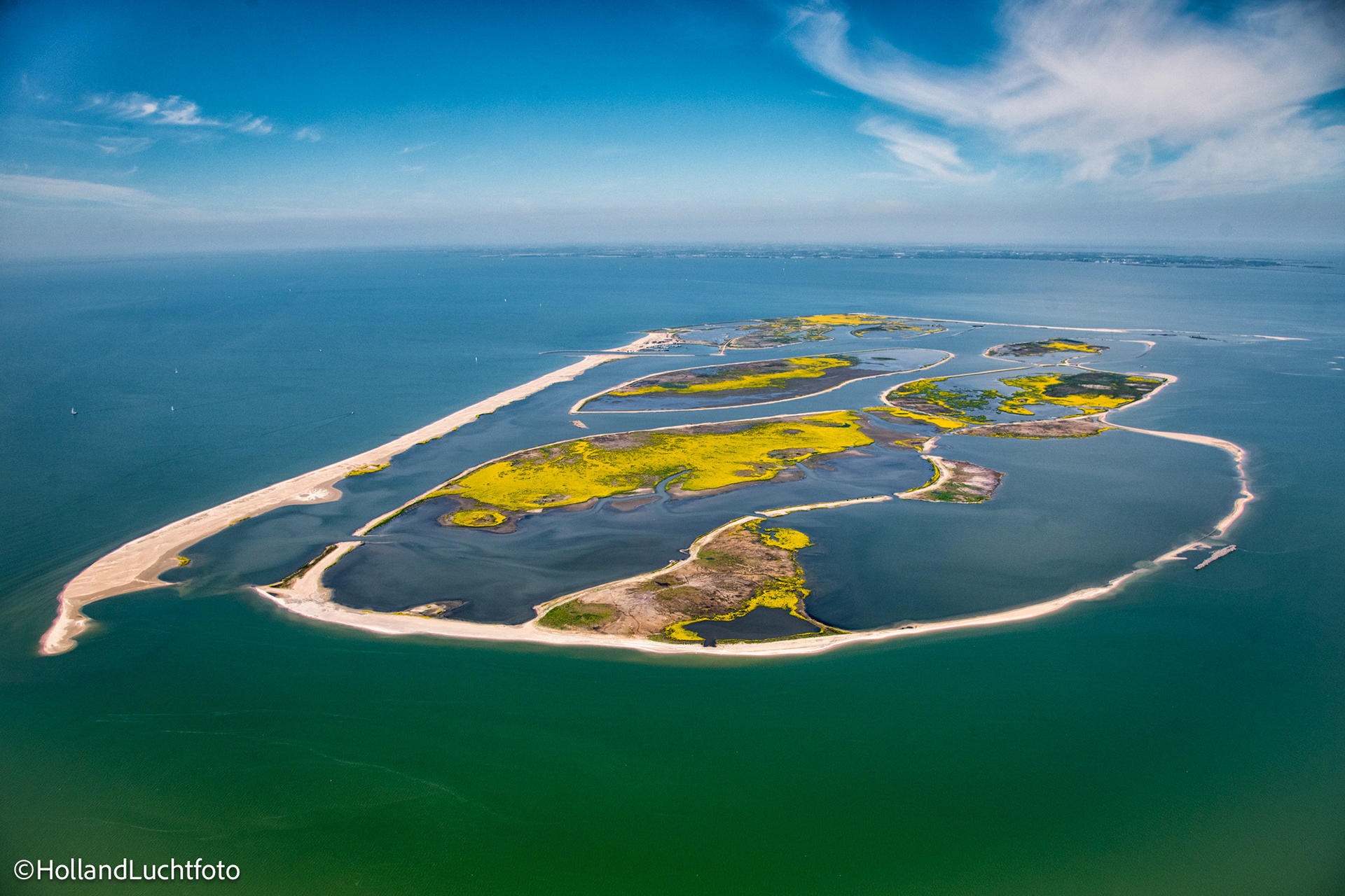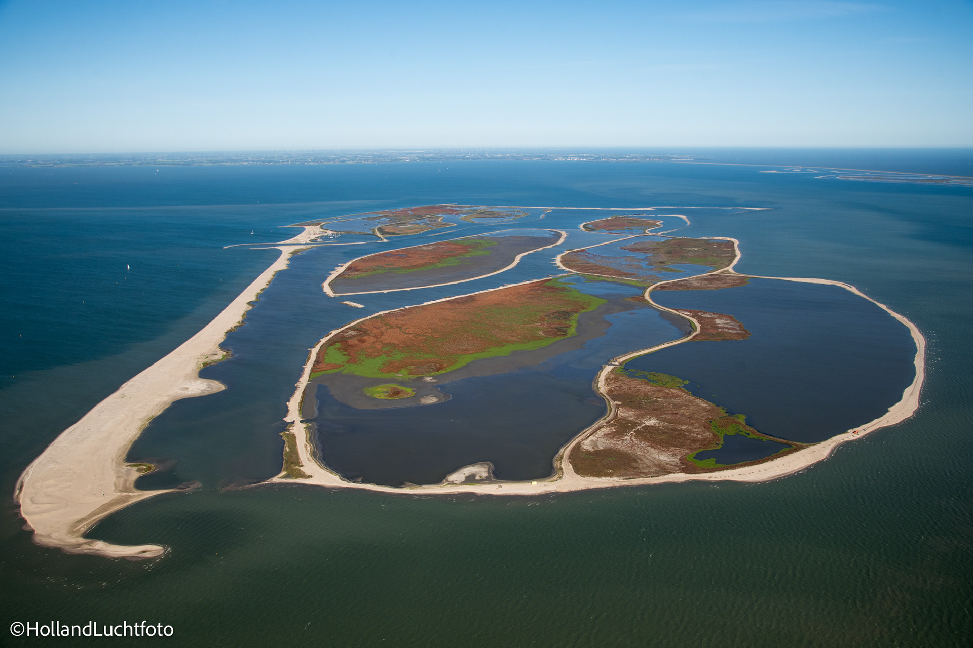 Inmiddels is de archipel uitgegroeid tot een volwaardig ecosysteem. Vanuit de lucht zie je nu: dynamische geulen en kreken, Groen dat terrein wint, met moerasvegetatie die de eilanden hun kleur geeft.