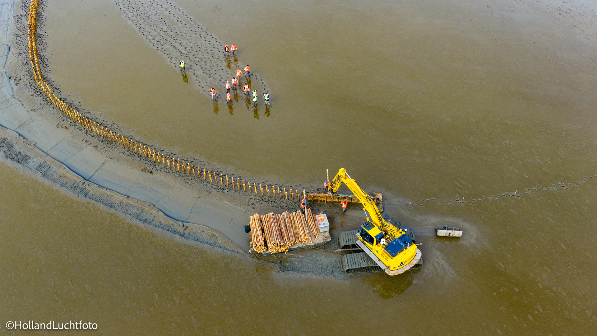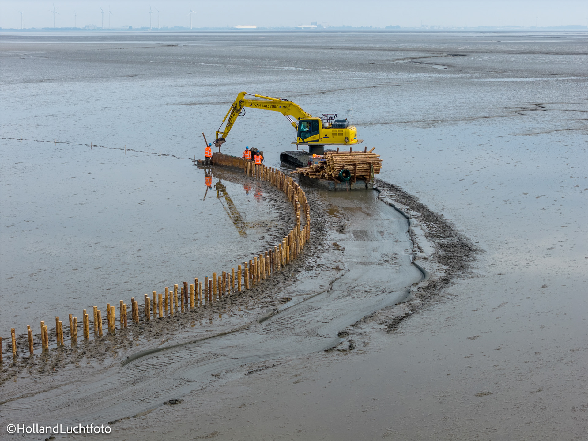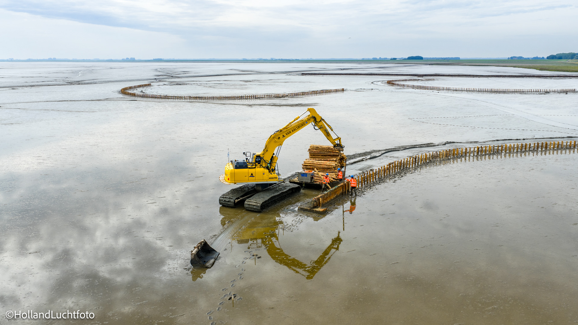 Op onze beelden is goed te zien hoe aannemer Van Aalsburg de rijshouten dammen in het gebied aanbrengt. Wat dit project visueel zo interessant maakt, is de vorm: de dammen worden niet in rechte lijnen, maar in halve manen en organische vormen geplaatst. Deze structuren zorgen voor de nodige luwte, waardoor het slib kan bezinken en de bodem langzaam ophoogt.